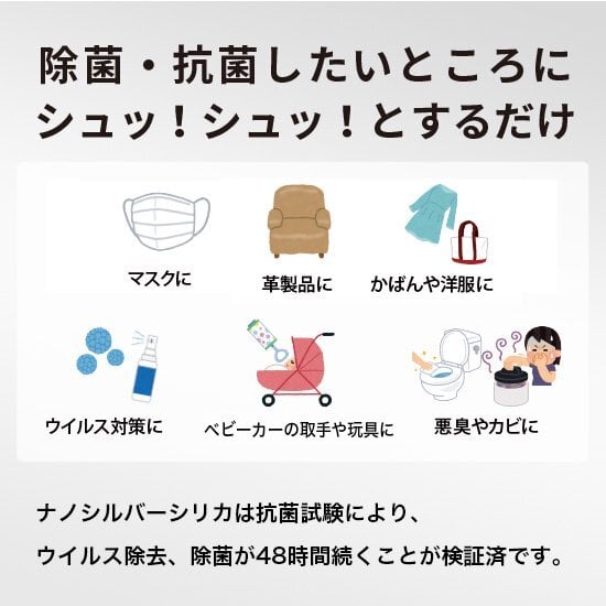 99%ウイルス除去・除菌。48時間持続。アルコール効果を超えた、人と環境に優しい抗菌スプレー。ナノ銀パワーでウイルス、細菌、悪臭、カビ対策に!お子様やペットがいる環境でも使える安心・安全の抗菌スプレーです。